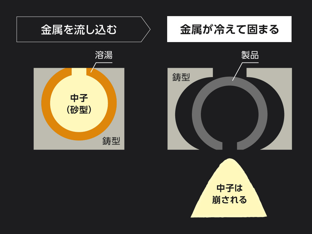 中子は砂を固めてつくったもので、空洞部分がある鋳物製品を作る際に使用します。
